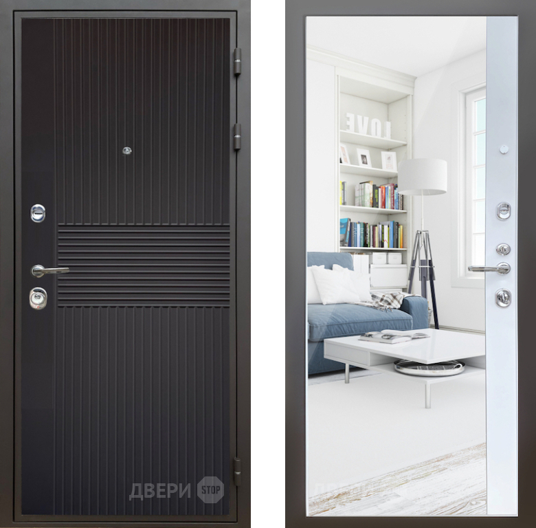 Входная Дверь Шелтер (SHELTER) Комфорт Черная шагрень 14 с зеркалом Белый матовый 960x2050 мм